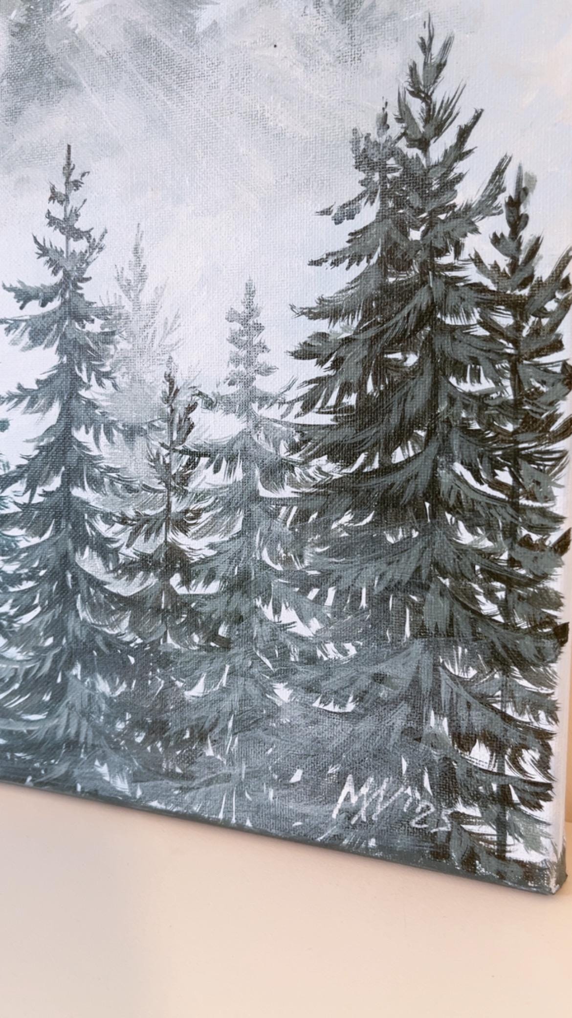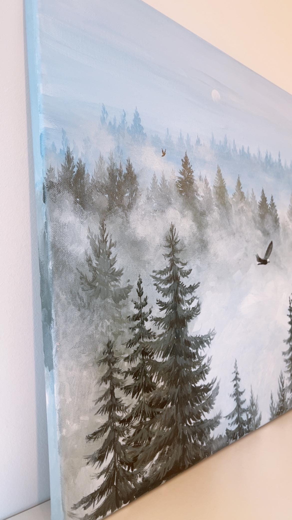 A serene misty forest landscape hand-painted with acrylics on an 18x24 inch unframed canvas. Layers of blue fog, evergreen trees, and a soaring bird create a peaceful, atmospheric nature scene perfect for living rooms, bedrooms, or office decor. Original artwork—no prints.