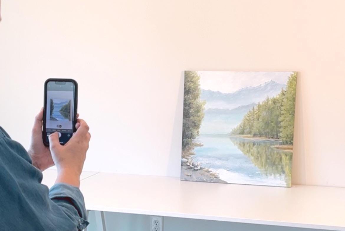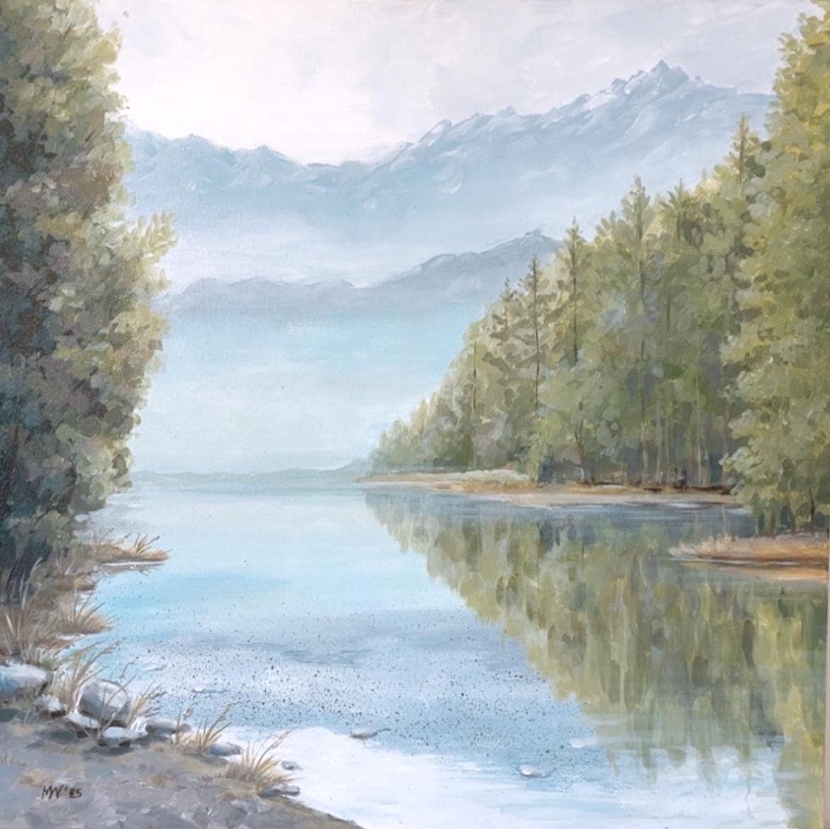 Bring the calmness of nature into your home with this hand-painted acrylic landscape. This painting captures the serene beauty of a mountain lake surrounded by lush trees, with soft mist hanging over the water. The peaceful reflection of the landscape creates a tranquil atmosphere perfect for any room in need of relaxation. The painting is done on a 24x24 inch canvas with a depth of 2 cm, making it an ideal size for a feature wall in your living room, office, or bedroom.