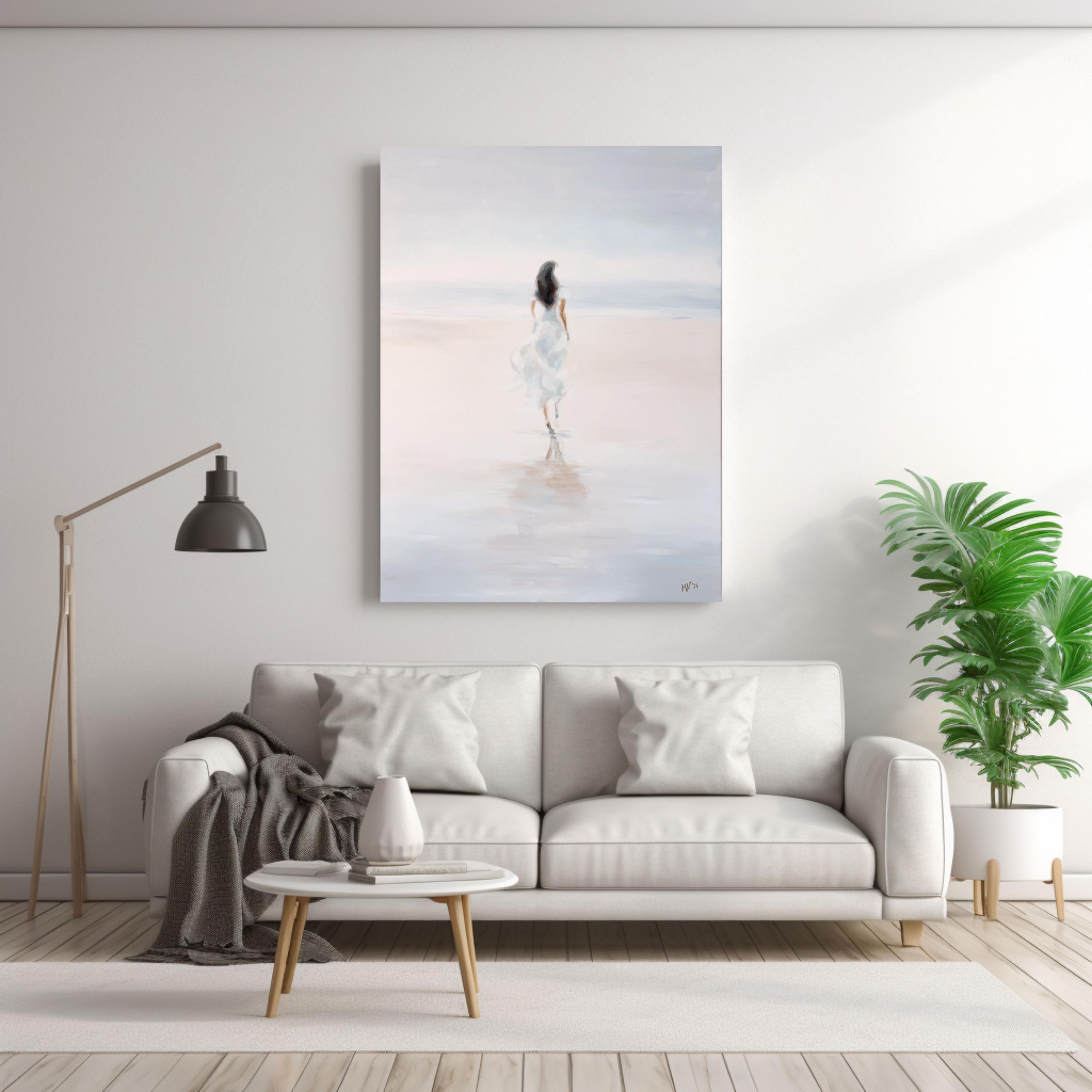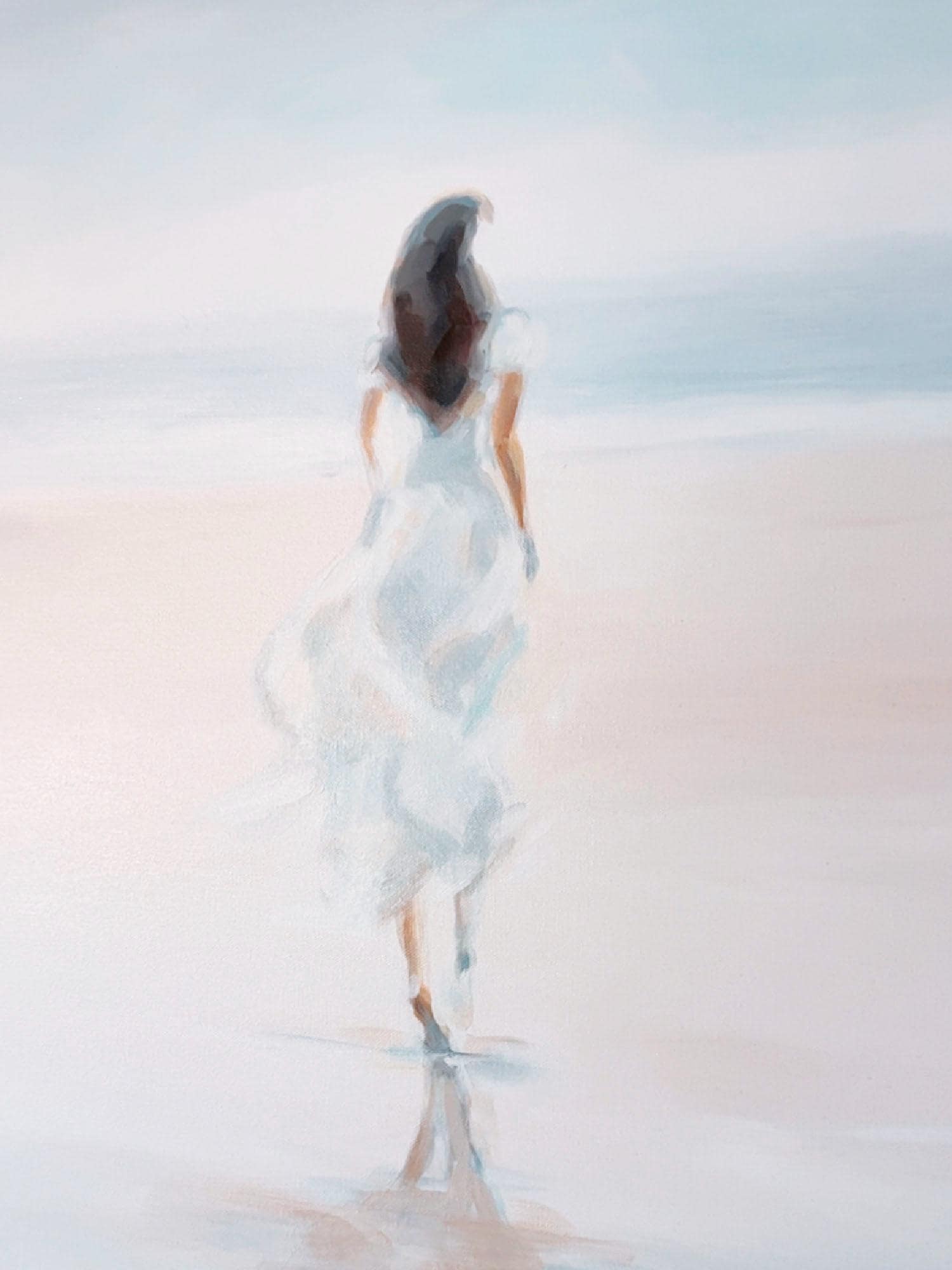 Executed in a loose, expressive manner, the work balances figurative presence with abstraction, inviting the viewer to project their own emotions and memories into the scene. The painting conveys a sense of serenity, freedom, and introspection, making it well suited for contemporary, coastal, or minimalist interiors.