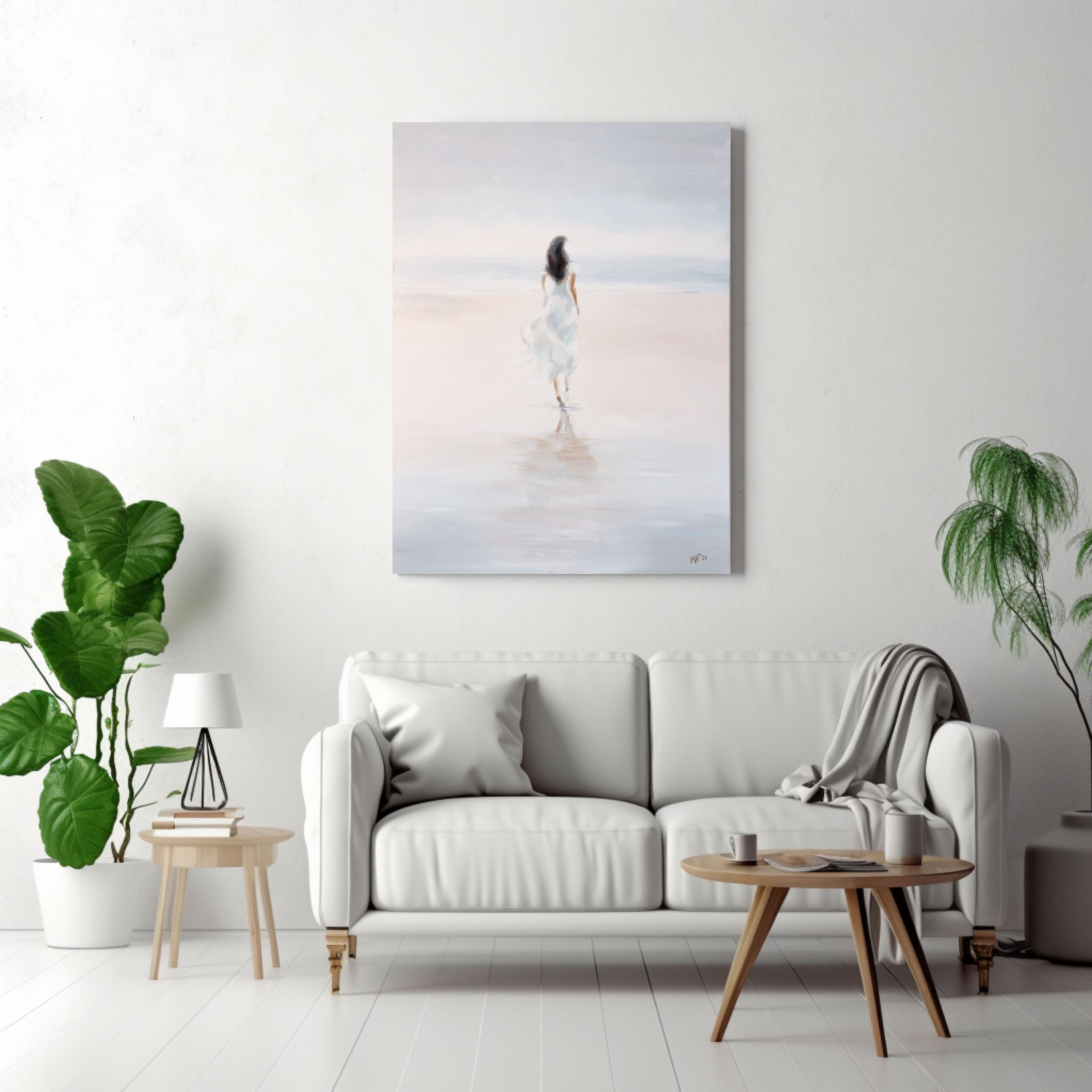 This original painting captures a solitary female figure walking along the shoreline, immersed in a moment of quiet reflection. Soft, muted tones of sand, sky, and water blend seamlessly, creating a calm and atmospheric seascape. The flowing dress and gentle reflection on wet sand emphasize movement, lightness, and emotional depth.